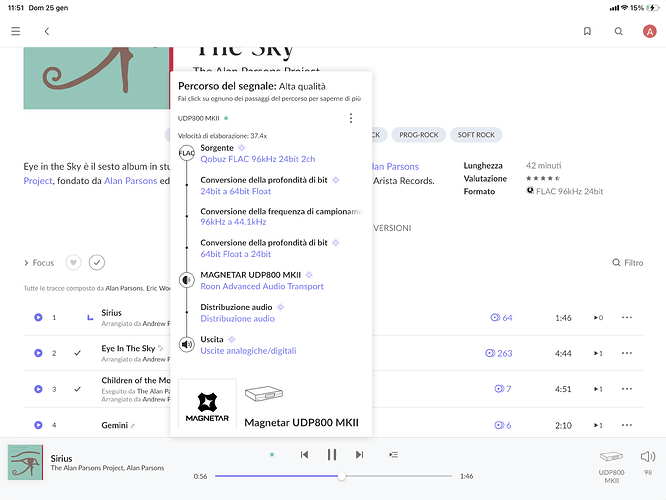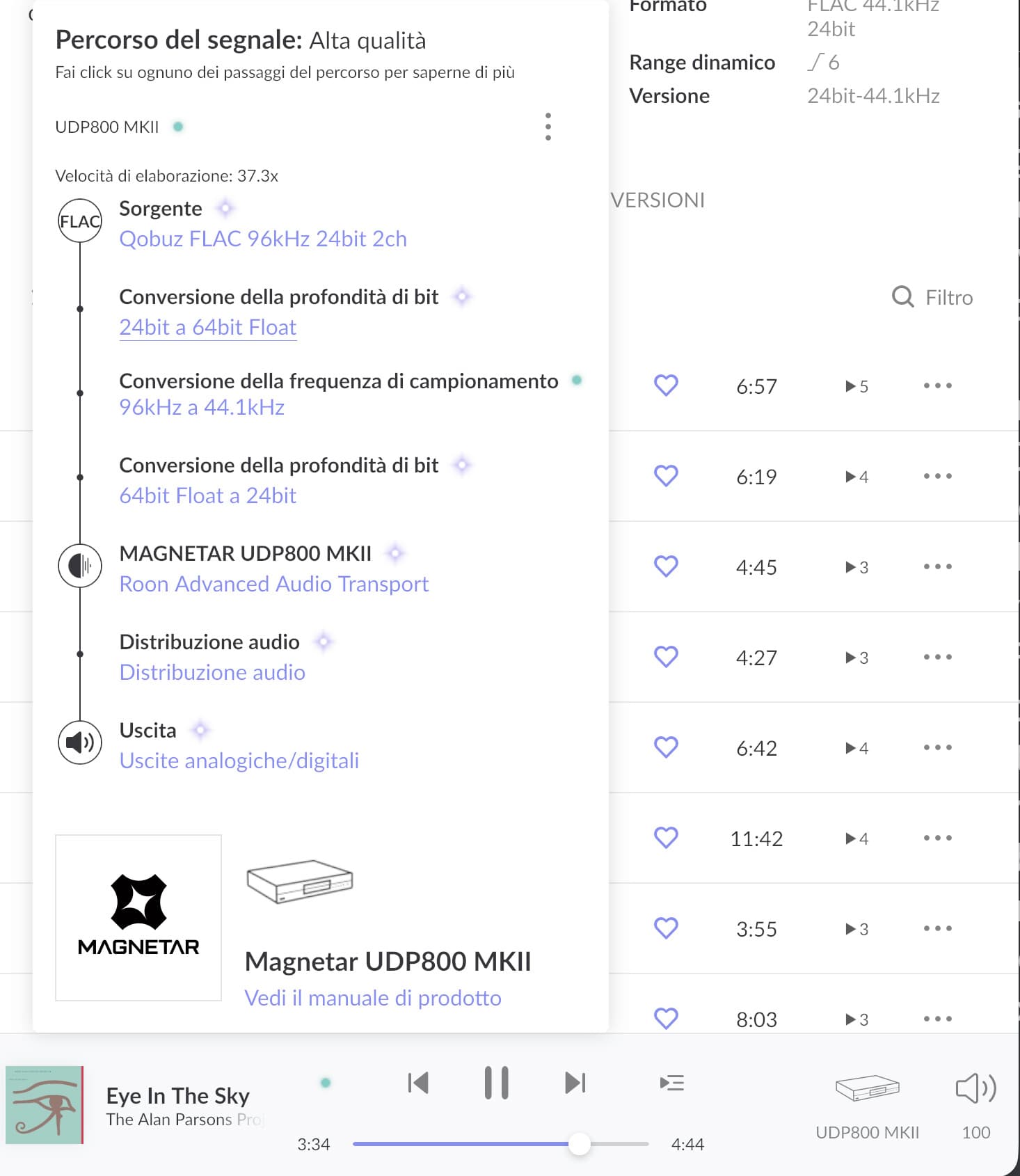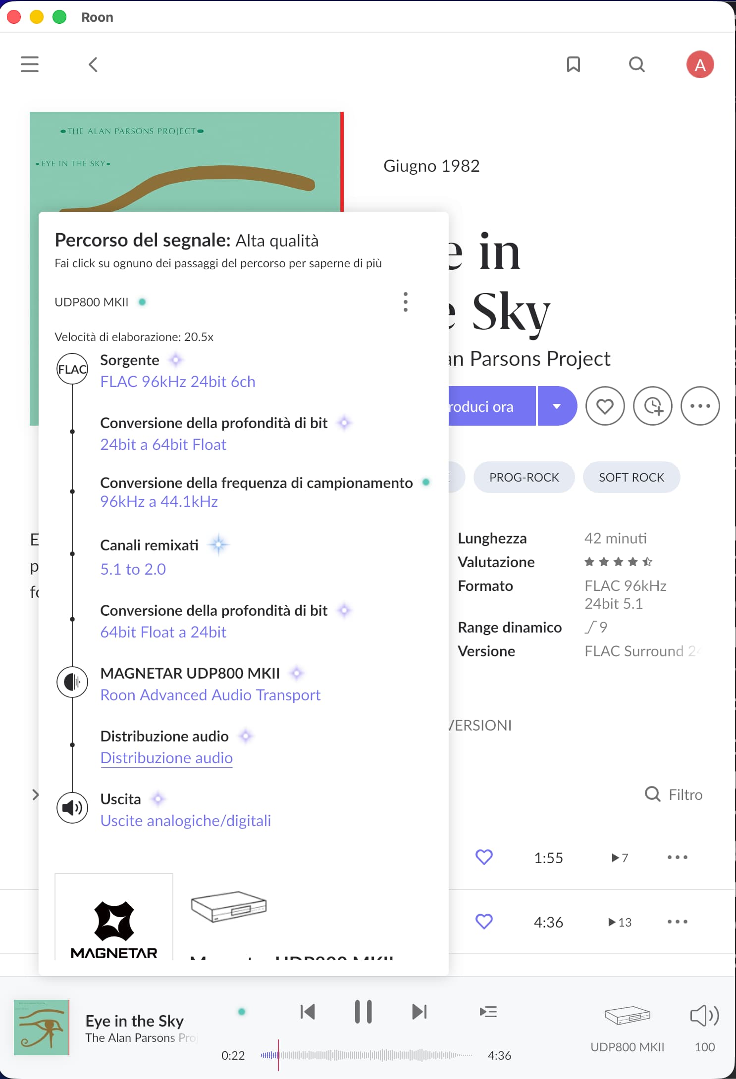 Scenario A) Magnetar UDP800MKII connected to my Anthem MRX740 exclusively in analog RCA, with a 2.0 speaker configuration (FrontRight-FrontLeft-using Anthem’s amp matrix function). In this scenario, when playing the Qobuz stereo track at 96 kHz and 24 bits, Roon downsamples to 44.1 kHz as previously reported. The same problem was also detected when playing the same track (Eye in the Sky)x via ROON but using version 5.1 (still 96 kHz at 24 bits) from the local archive, with the only difference being the conversion step from 5.1 to 2.0 channels. However, I don’t see how, in this scenario, the amplifier settings could influence the rest of the upstream chain in any way, given that the connection between Magnetar and Anthem is purely analog.