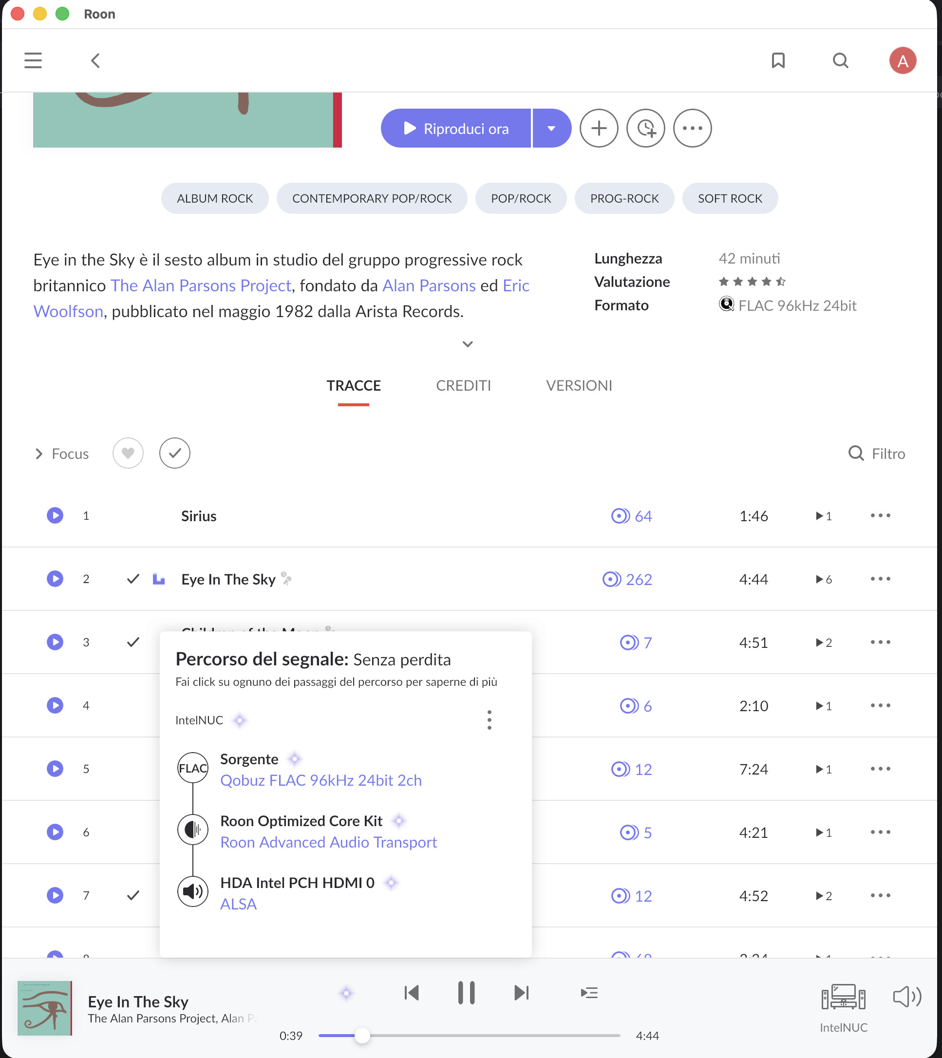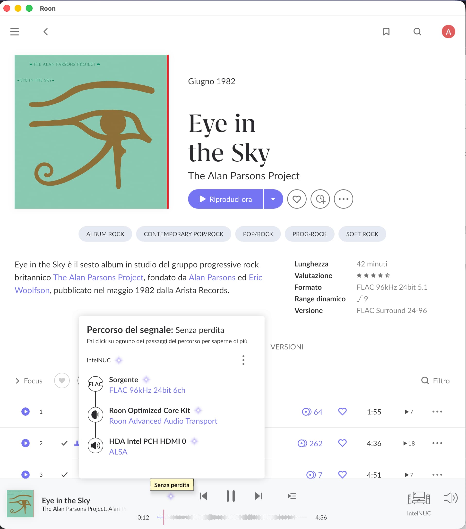 Scenario C) Playback of the same two test tracks (stereo and multichannel) but this time using the HDMI connection of the Intel NUC where ROON Rock is installed, again to the Anthem. In this case, Roon behaves as expected, sending the signal without any channel mapping conversion or downsampling.