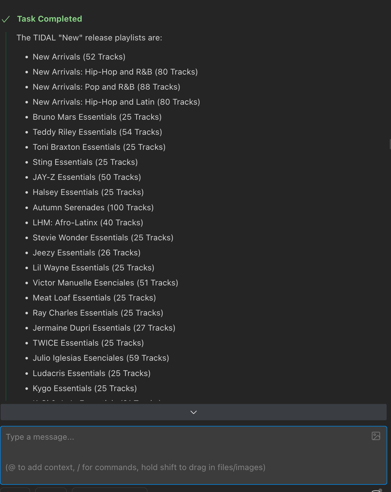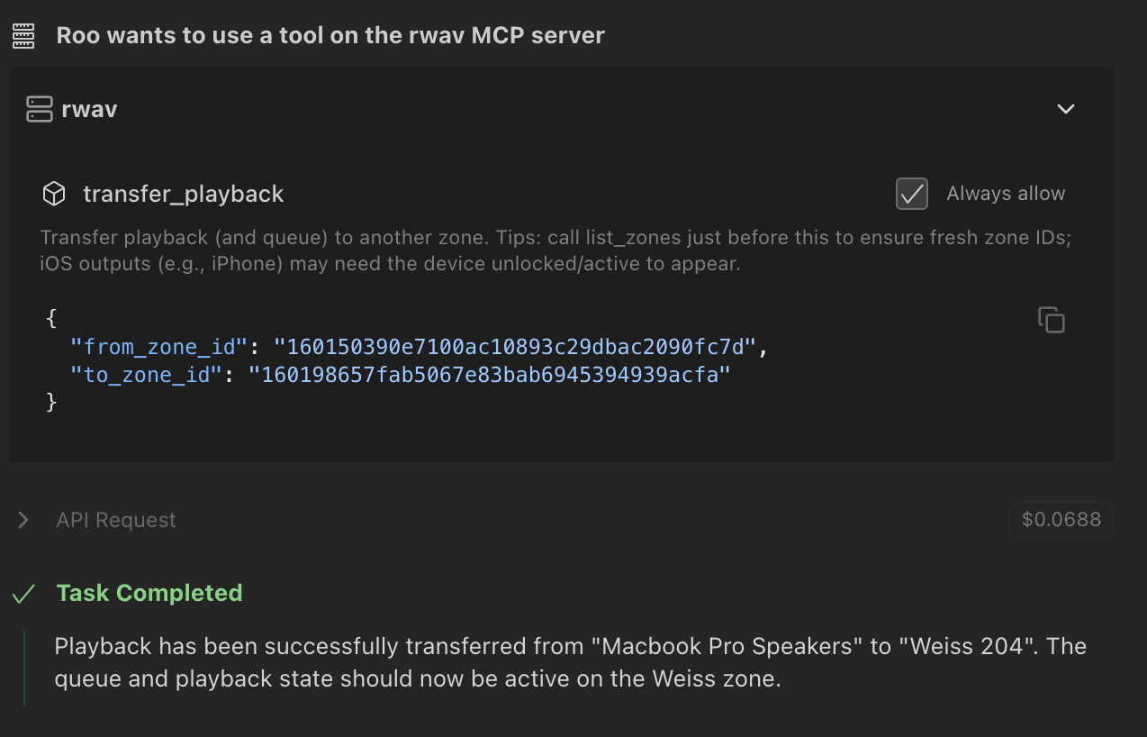 I’ve written a MCP Server for Roon and am just giving it a little more polish - although I could do with some volunteers who might want to check it out and help me catch any bugs or nonsense paths that need tidying up. I’m using it with Roo Code VS Code extension and also OpenAI Codex VS Code extension - although it should work just fine in Claude Desktop or Cursor. It needs my Bridge extension to work. If anyone is interested, I can provide a full feature set (from zones, recent history, browse library, browse streaming services, create playlist, explore artist, albums, tracks, transfer playback, group, skip, play, pause etc etc). I need a couple more days to get the deployment up and running for both the MCP Server and Bridge.Here are some screen shots of it being controlled by GPT-5 in Roo Code extension.