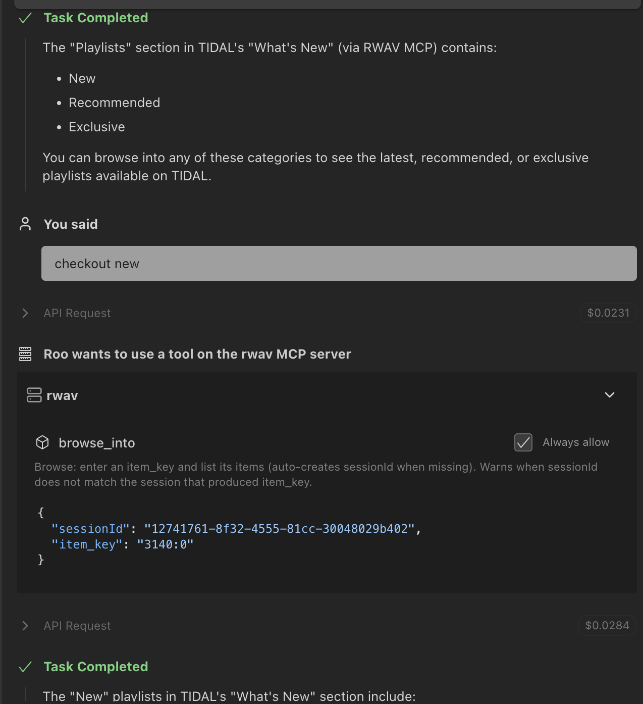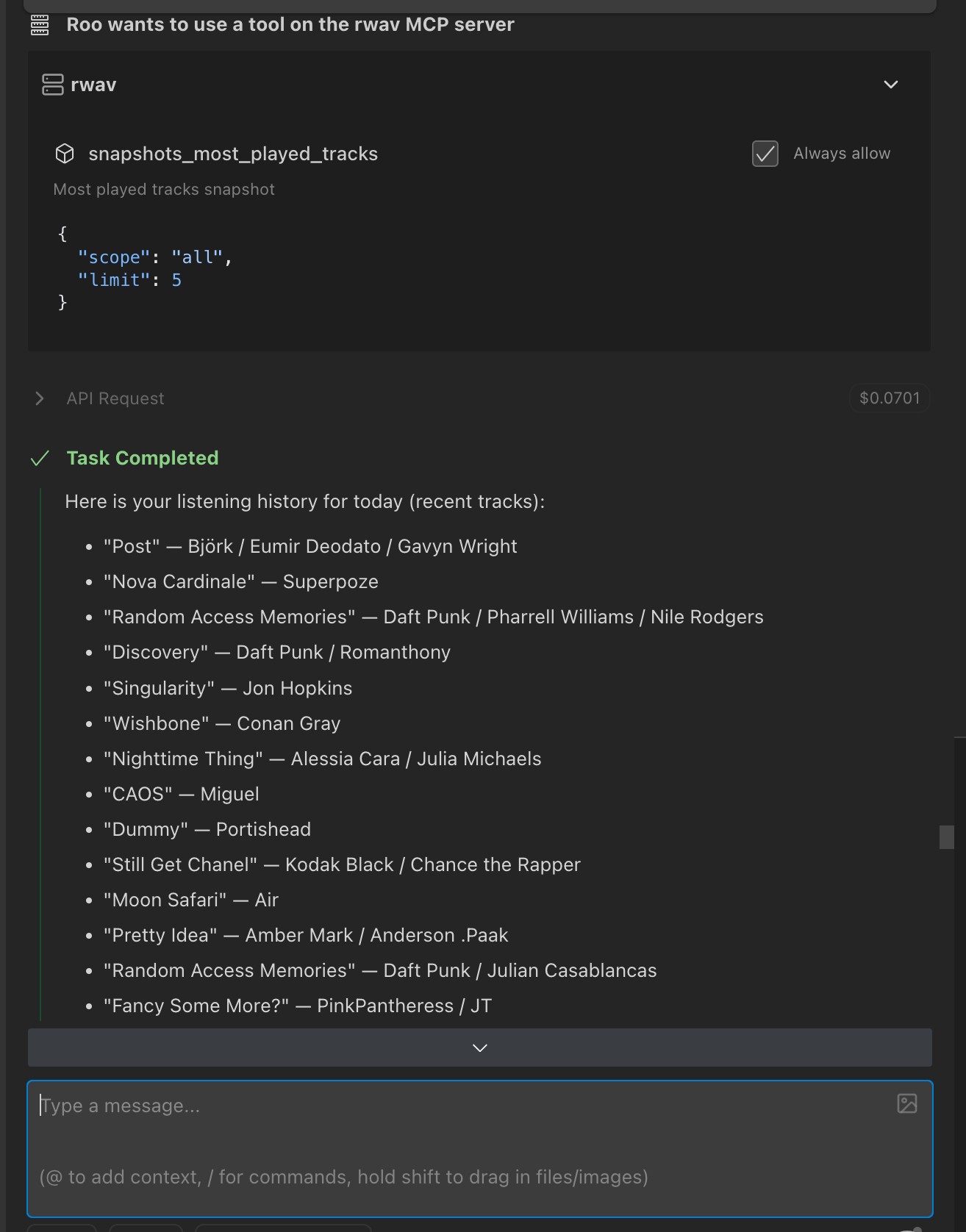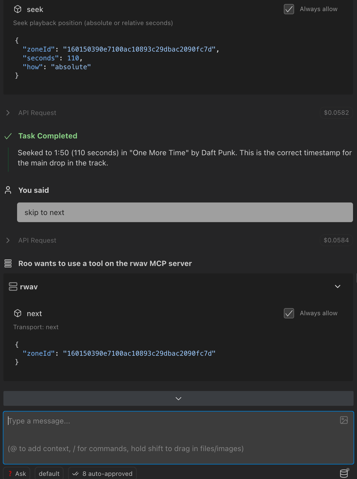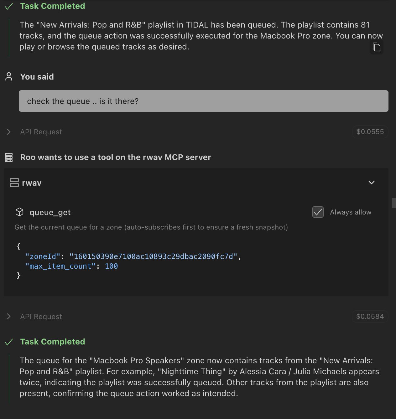 Further to my last post about my MCP Server for controlling Roon - here are a few more screen shots of it working in Roo Code VS Code extension - hopefully it will give you all a good idea of what it is capable of. I hope to get it deployed along with the bridge extension in the next few days. If anyone is interested in helping to test it in anger, could you please let me know?