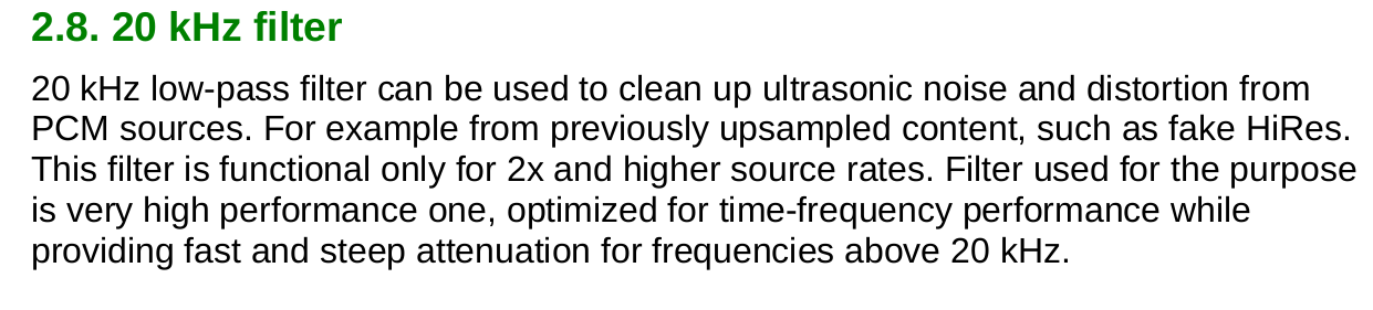 Obviously this is not ideal for âproperâ hi-res material and is not bit perfect, but at least you will just get clean 20-20k Hz region for all all music and you wonât get any junk above 20kHz associated with crappy upsampling of fake hi-res.