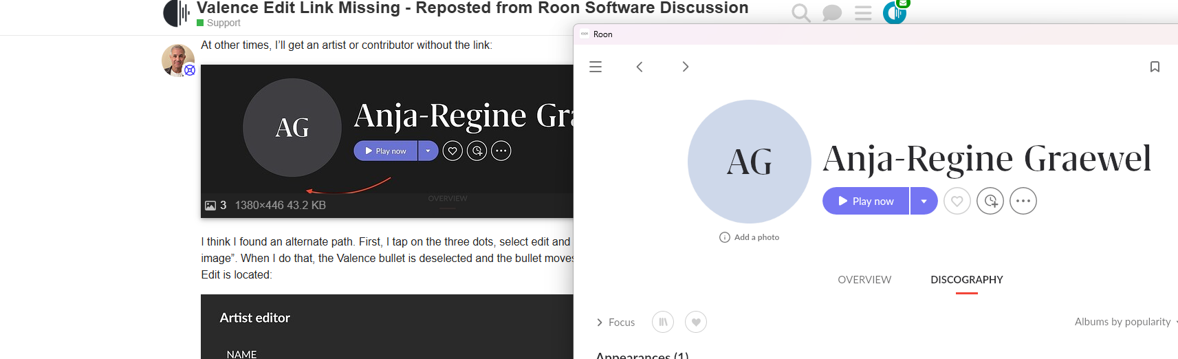 So rolling back to the contributing artist Anja-Regine Graewel, it appears that I am unable to add her image in Valence as this artist is “Unidentified” in Roon. I can add the image locally. If this artist later appears in the Roon database, my local image will not be added unless it was added from the ingesting source. That seems to be a lost opportunity, but I understand.