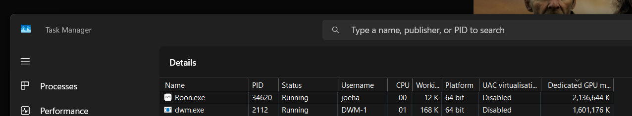 more info: Roon starts at about using 500mb VRAM but slowly inflates over time and I have to end process and restart process about once a day or I face slowdown on the rest of my system. I tested it over 3 days and it ended up using 6gb and it just increases until you manually stop it.