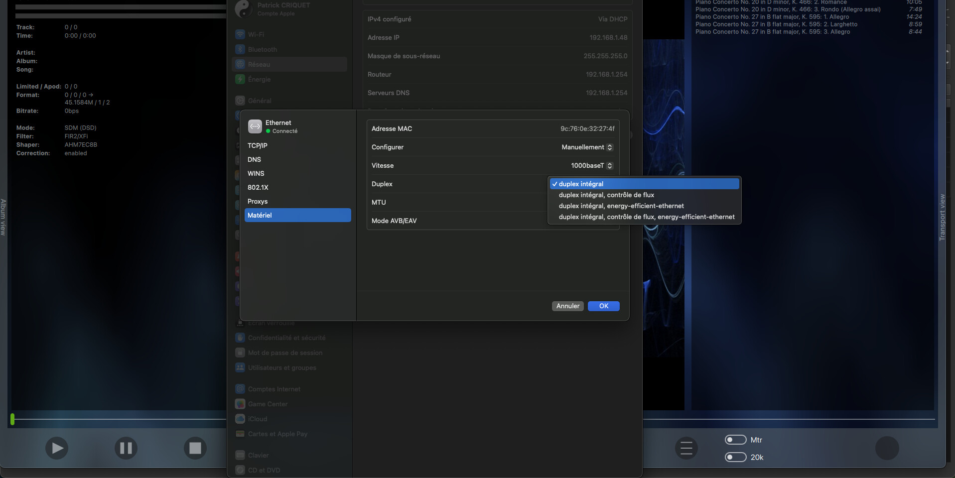 There’s one interesting glitch anyway (with either box or TC ethernet connections): if I try to ensure 802.3x hardware network settings they always revert to full duplex, it is impossible to get an option with flux control and/or energy efficiency to stick (picture is in French but shouldn’t be difficult to decypher.