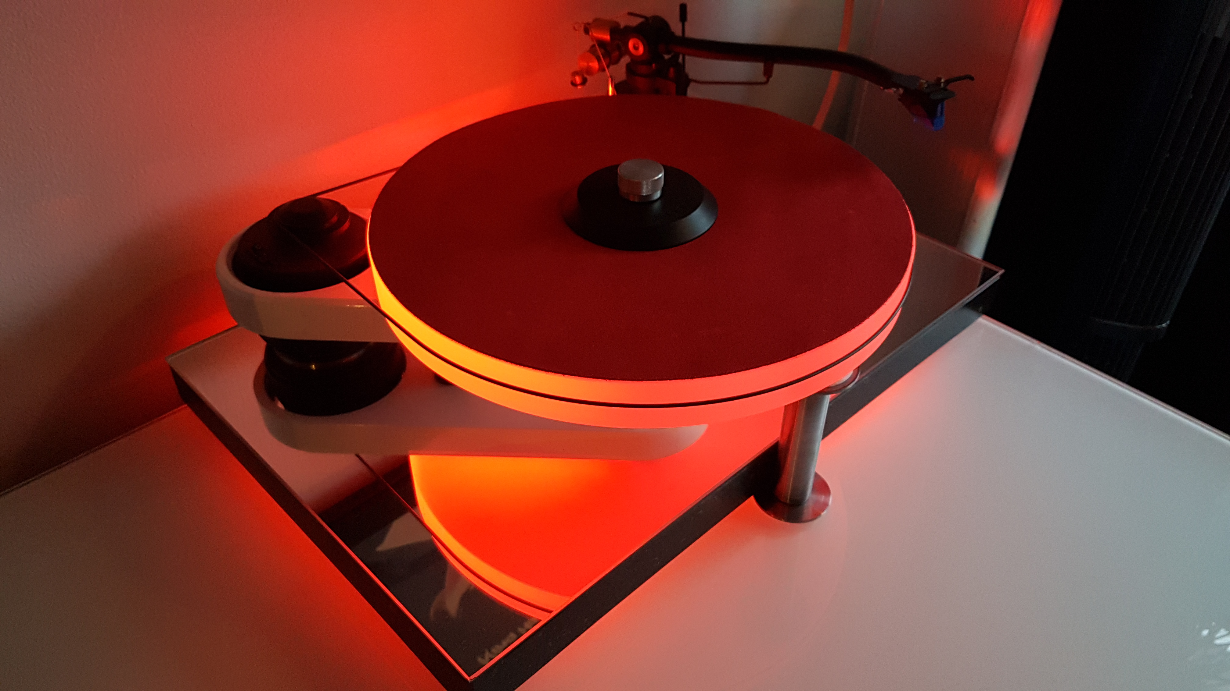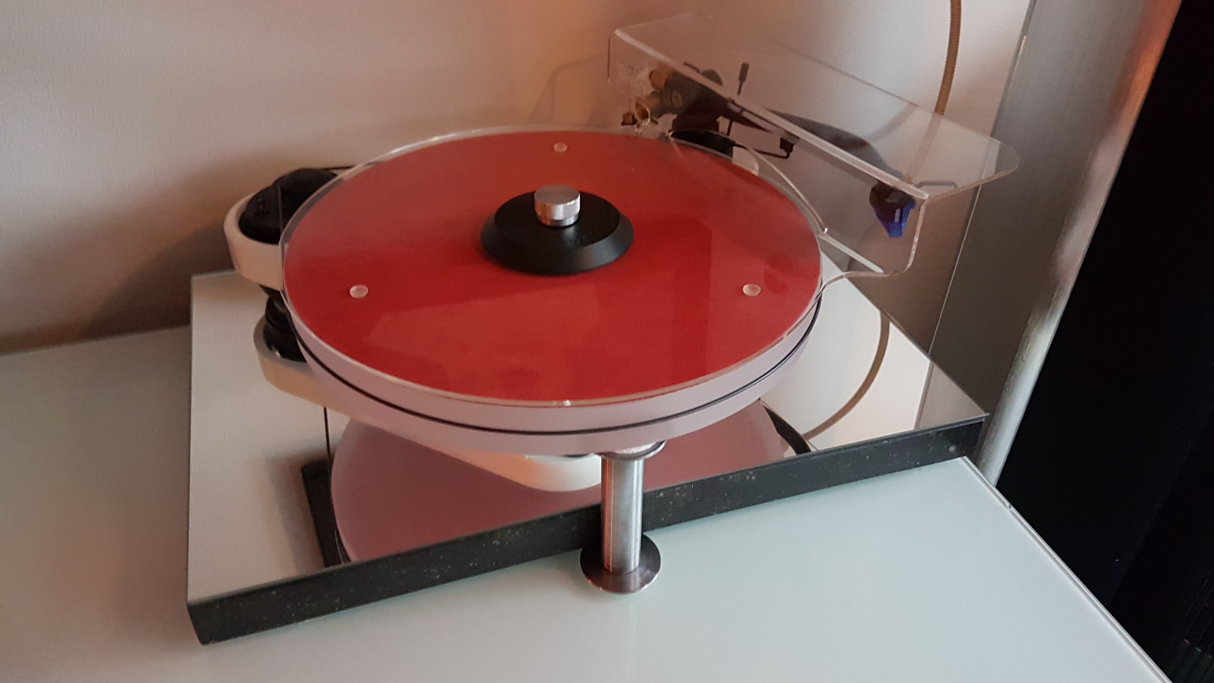 I’m proud owner of a Pro-Ject RPM 1 which I’ve customized; acrylic platter, red LED lights, marble base plate with mirror on top, selfmade counter/anti skating weights, better cabling, Ortofon Blue cartridge, red leather mat, dustcover & puck. The steel pillar in the front is to prevent the turntable to fall over when one of my cats would stand on it (which they never did till now)
