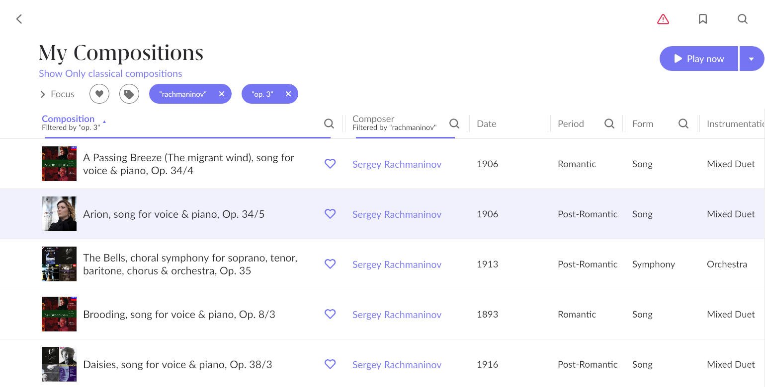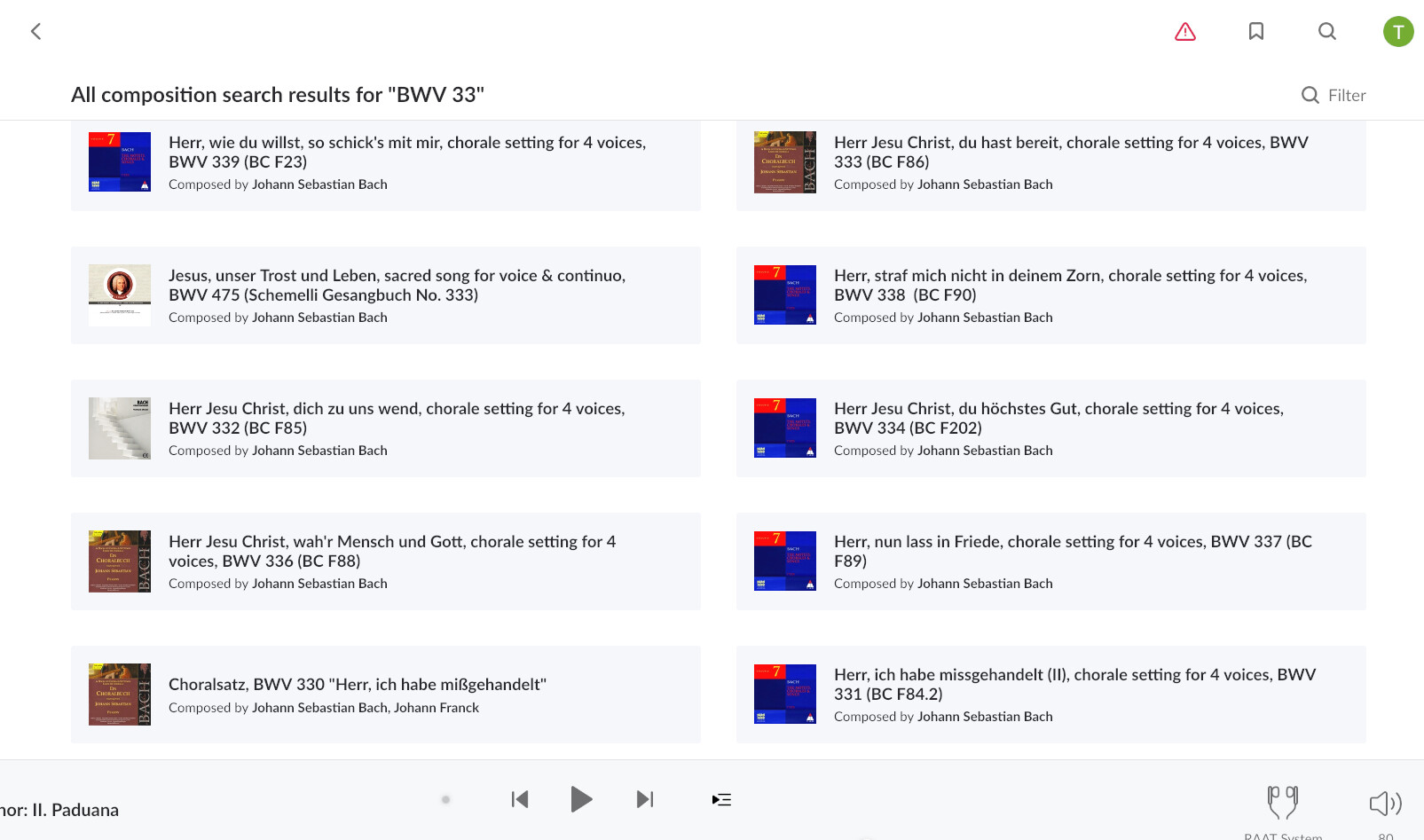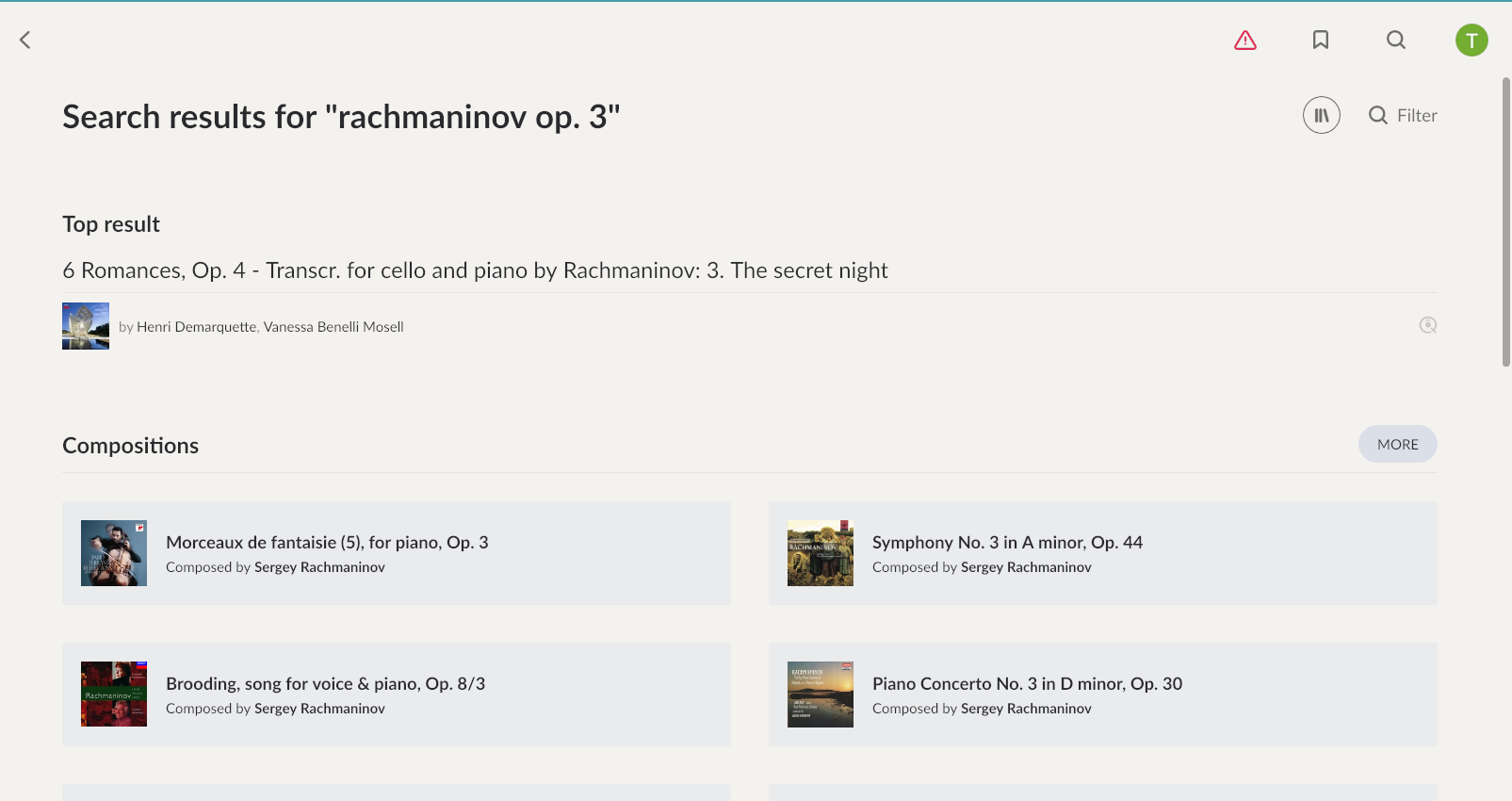It is difficult to imagine a more specific search than a search on an Opus or Catalogue number when navigating Classical compositions. That is the purpose of opus and catalogue systems. With many famous and/or prolific composers a fuzzy search will therefore lead to quite unmanageable results. For example, if I do a search on Rachmaninov Op. 3, roon will return not 1 result but 56 results. That is, not only every valid combinatoric of Op. xxx containing a 3 but also with multi part works every valid combinatoric of Op. xxx/xx, containing a 3. This is probably an extreme case in my library as Rachmaninov is a favorite composer. But I have long noticed this. Whatâs the sense? I am not sure it was always like this but I can no longer remember when this odd behaviour was introduced.