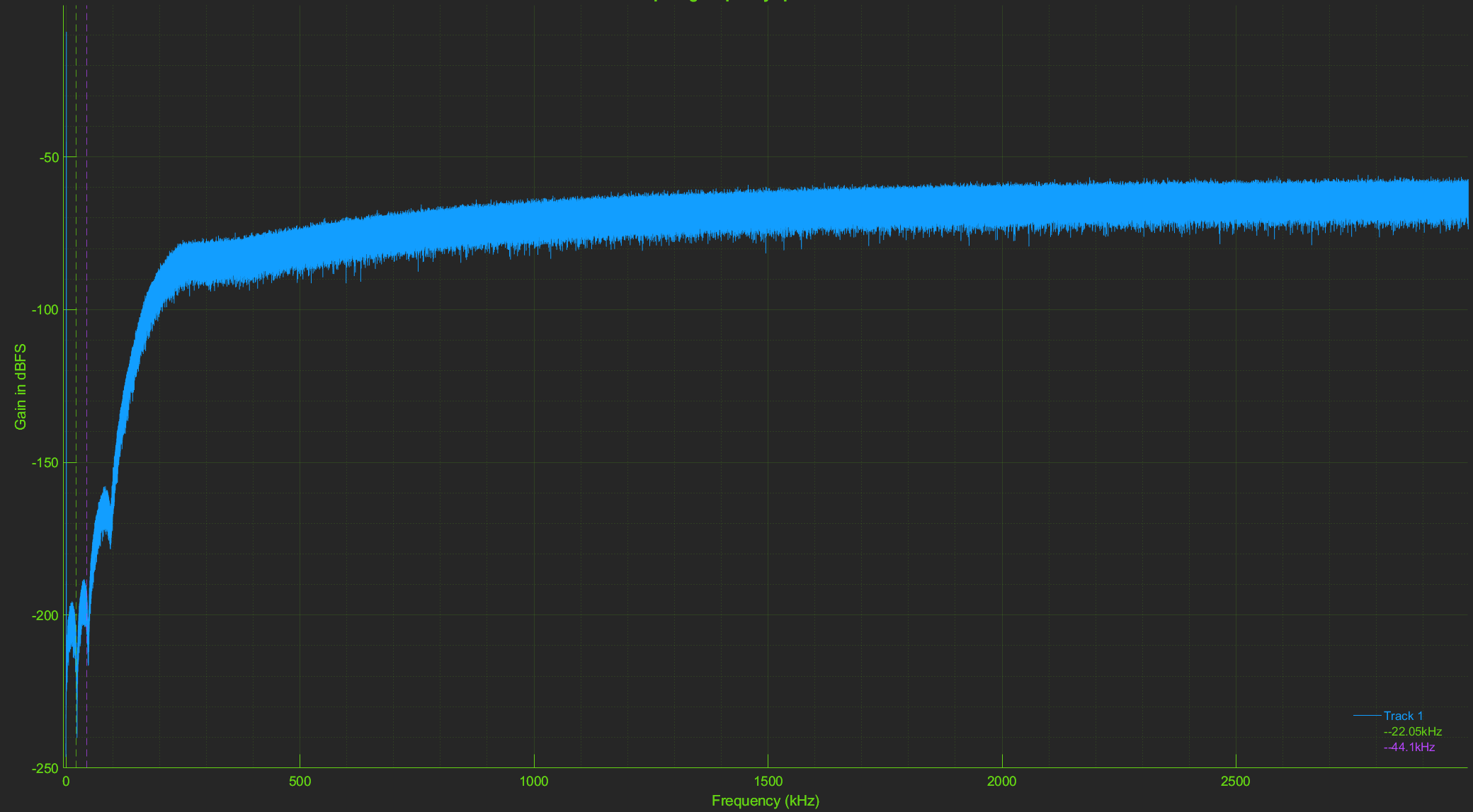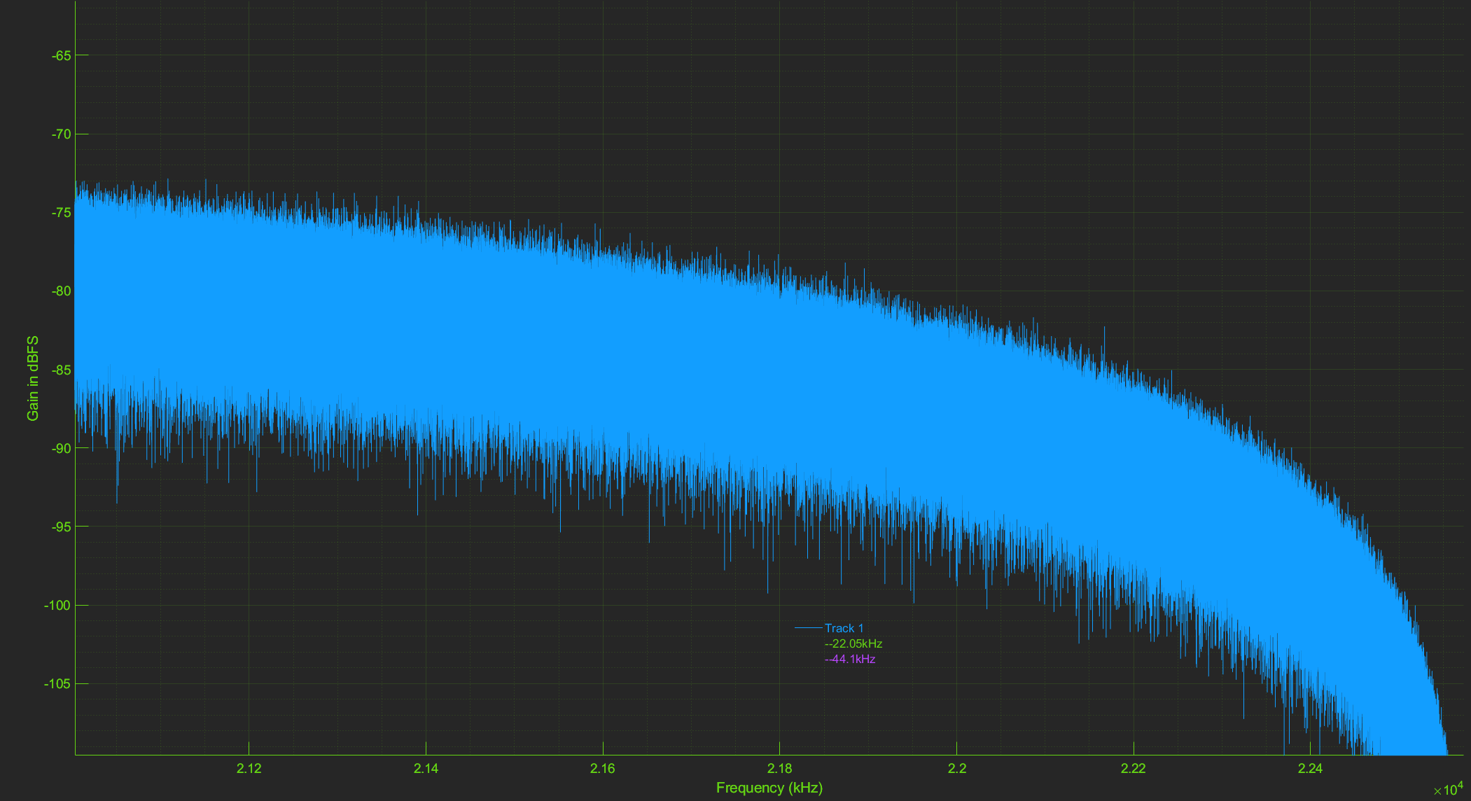 If we then compare the output to what comes out for example from typical AKM based DAC analog outputs, with 0 - 22.05 kHz sweep from 44.1 kHz source data: