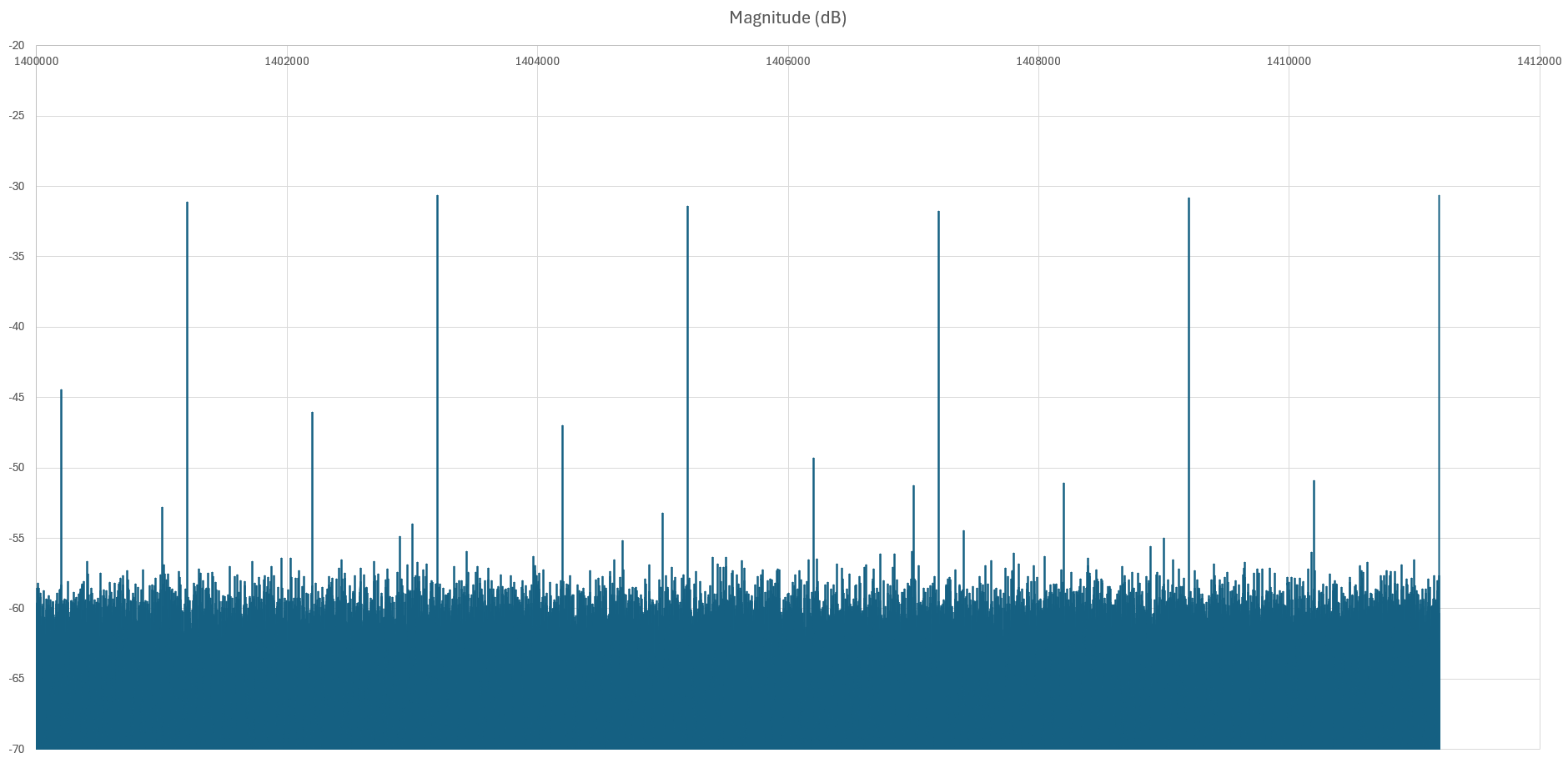 Remember that the full band output data amplitude is always the same, 0 dB! Donāt be fooled by FFT, because the 0 dB noise is spread over wider spectrum than discrete tones.