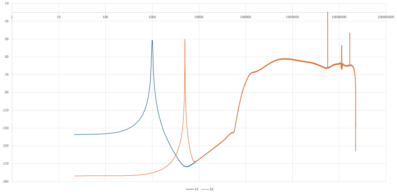I changed my ASIO grabber and now it supports everything you throw at it, so I was able to use AHM7EC8B modulator with DSD1028. I converted two signals separately, a 1kHz sine and a 5kHz sine, and plotted both spectra together. This is the full range (log):