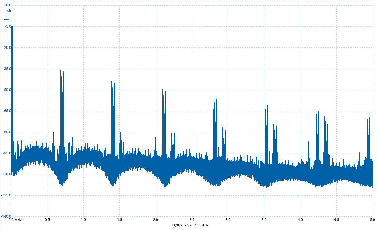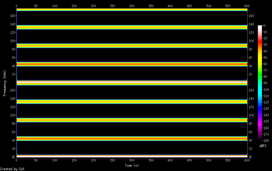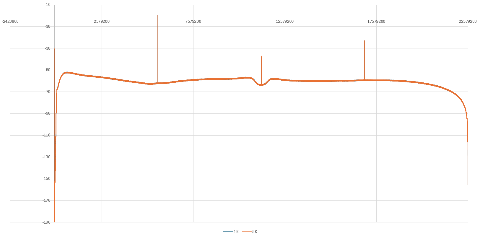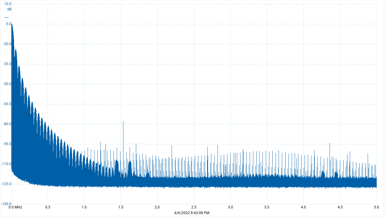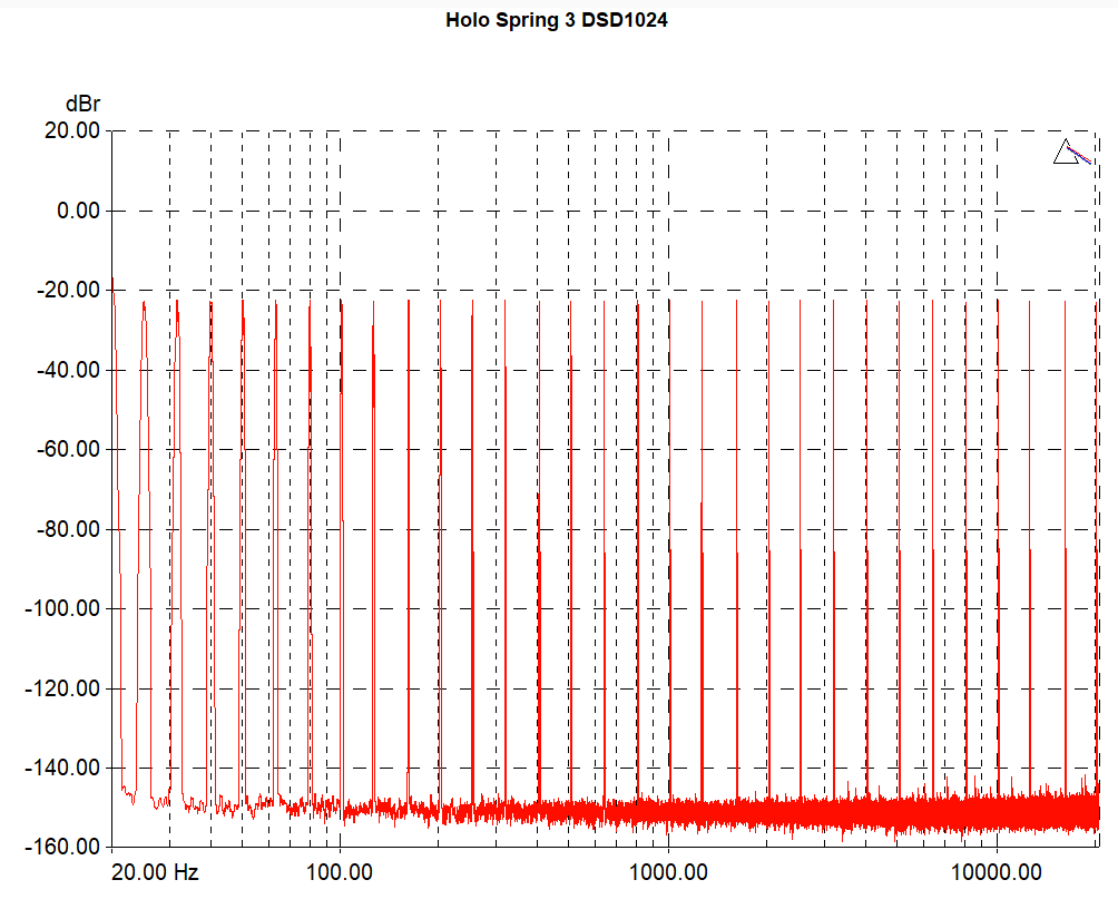 Once again, my graphs don’t show anything over fs/2, so there’s no redundancy there and thus should contain no periodic images. To make that clear, this is the full spectrum again - linear this time - with the upper axis limit set exactly to 22,579,200Hz, i.e. fs/2, a.k.a. the Nyquist limit, for DSD1024: