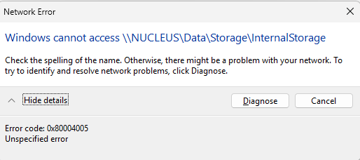 Trying to do some Internal Storage file maintenance and I can’t get my file explorer in Windows 11 to pull up in the “Network”. when I search for \\NUCLEUS\Data\Storage\InternalStorage the file explorer can’t find any matches. I have my nucleus connected via ethernet to my Netgear nighthawk router.
