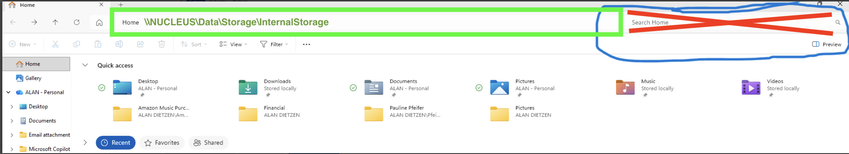This is the Windows 11 File Explorer with labeled areas. Make sure you enter the \\NUCLEUS\Data\Storage\InternalStorage into the (green) address bar, not the (red) search box.